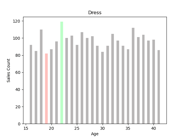 I wanted to see which category did better in the group aged 18-24 or which color did better in tops. This function is easy to use and allows you to select the first and second categories and then compare them to the sales counter.
